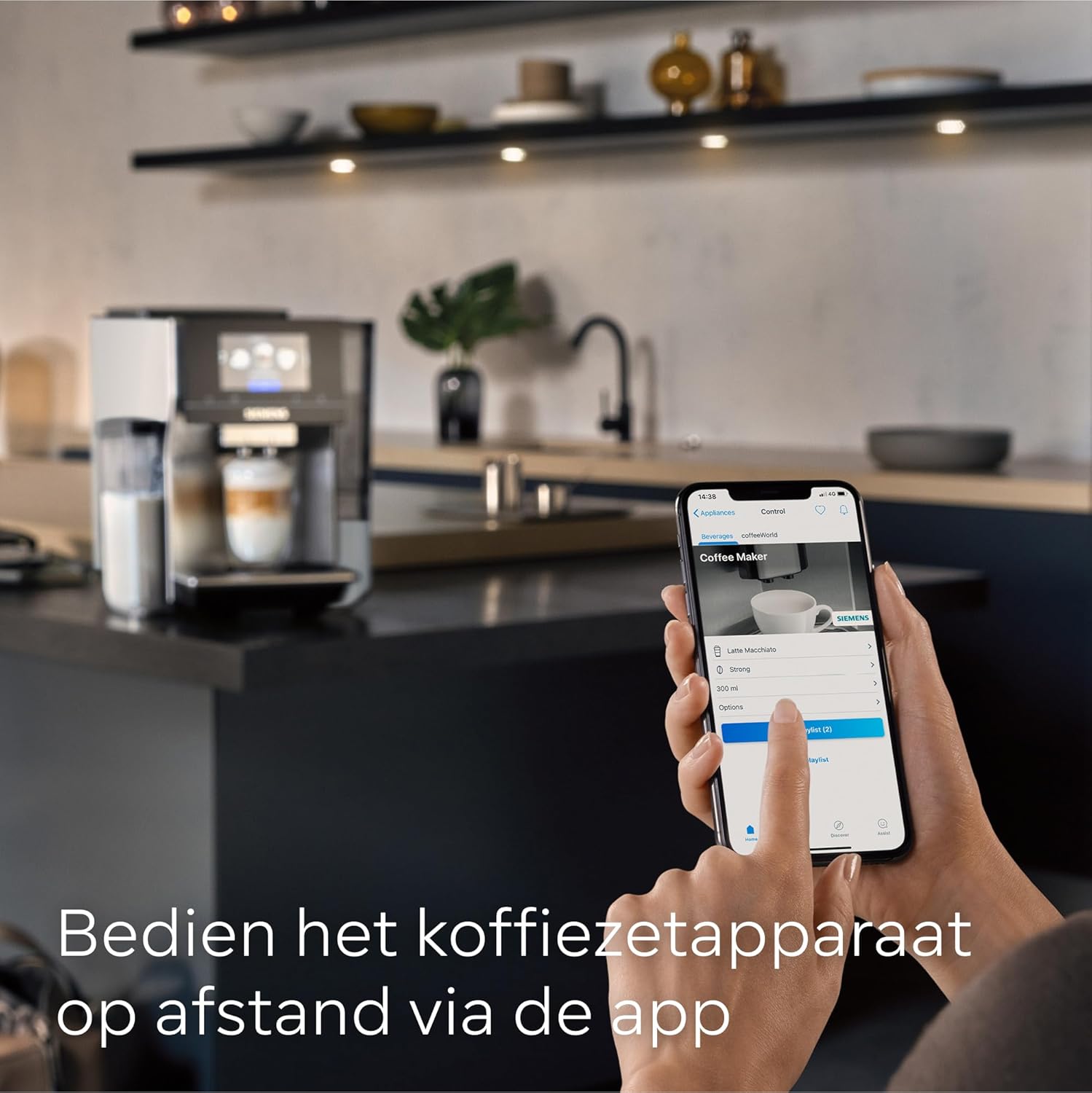 Dankzij de Home Connect functie kun je je koffiemachine vanaf je smartphone bedienen, waar je ook bent. Dit maakt het mogelijk om de machine voor te verwarmen of je favoriete koffie te bereiden zonder je huis binnen te lopen. Deze slimme functie biedt gemak en flexibiliteit in je dagelijks leven.